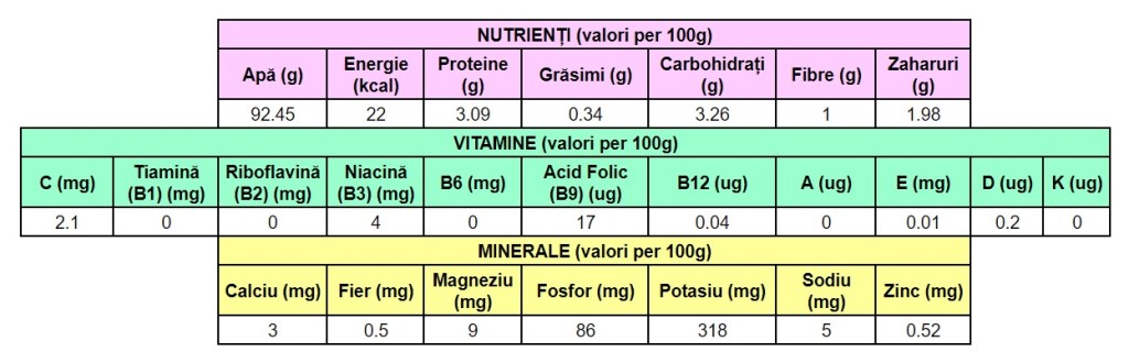 *Valorile nutriționale ale fructelor și legumelor pot varia în funcție de tipul de agricultură folosit la cultivarea lor și de perioada care a trecut de când au fost culese până când au ajuns la noi în farfurie. Căutați produse locale, de sezon, cât mai proaspete pentru a beneficia de un maxim de vitamine, minerale și fitonutrienți.
