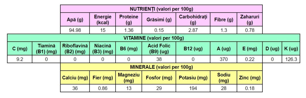 *Valorile nutriționale ale fructelor și legumelor pot varia în funcție de tipul de agricultură folosit la cultivarea lor și de perioada care a trecut de când au fost culese până când au ajuns la noi în farfurie. Căutați produse locale, de sezon, cât mai proaspete pentru a beneficia de un maxim de vitamine, minerale și fitonutrienți.