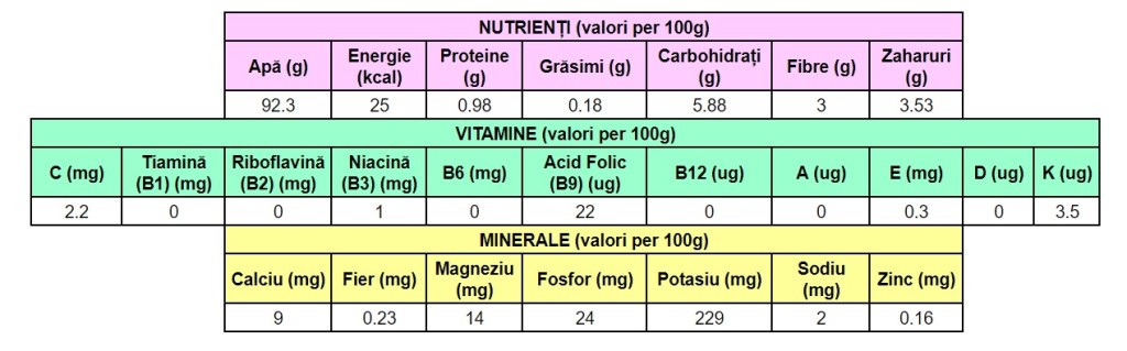 *Valorile nutriționale ale fructelor și legumelor pot varia în funcție de tipul de agricultură folosit la cultivarea lor și de perioada care a trecut de când au fost culese până când au ajuns la noi în farfurie. Căutați produse locale, de sezon, cât mai proaspete pentru a beneficia de un maxim de vitamine, minerale și fitonutrienți.