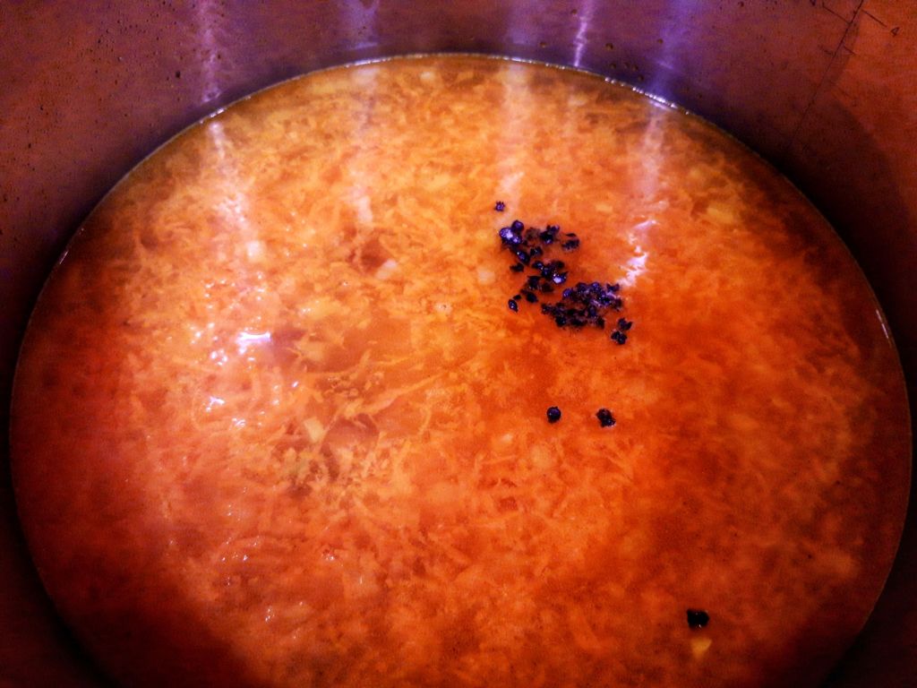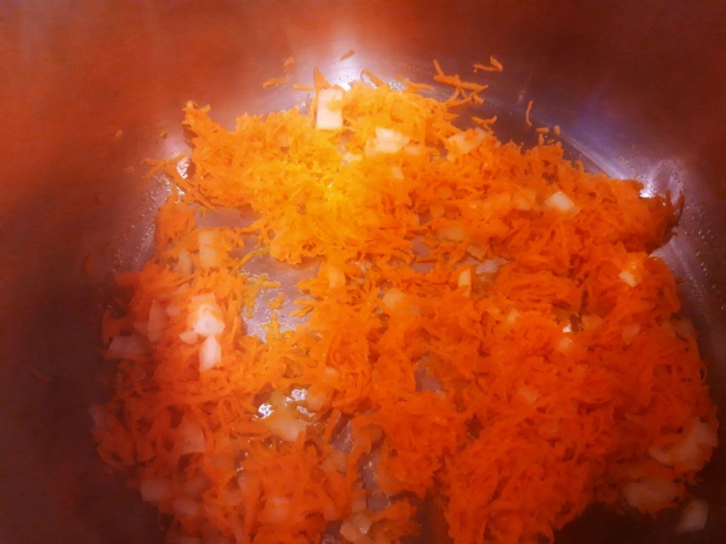Curățați ceapa, morcovul, usturoiul, tăiați-le foarte fin și căliți-le în uleiul încins.