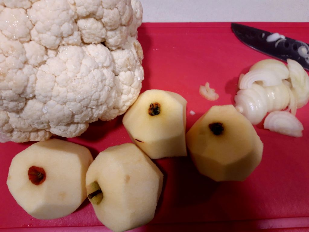 Curățăm merele și le tăiem cuburi, spălăm conopida și o rupem în buchețele mici, cât de cât egale. Tăiem ceapa rondele.