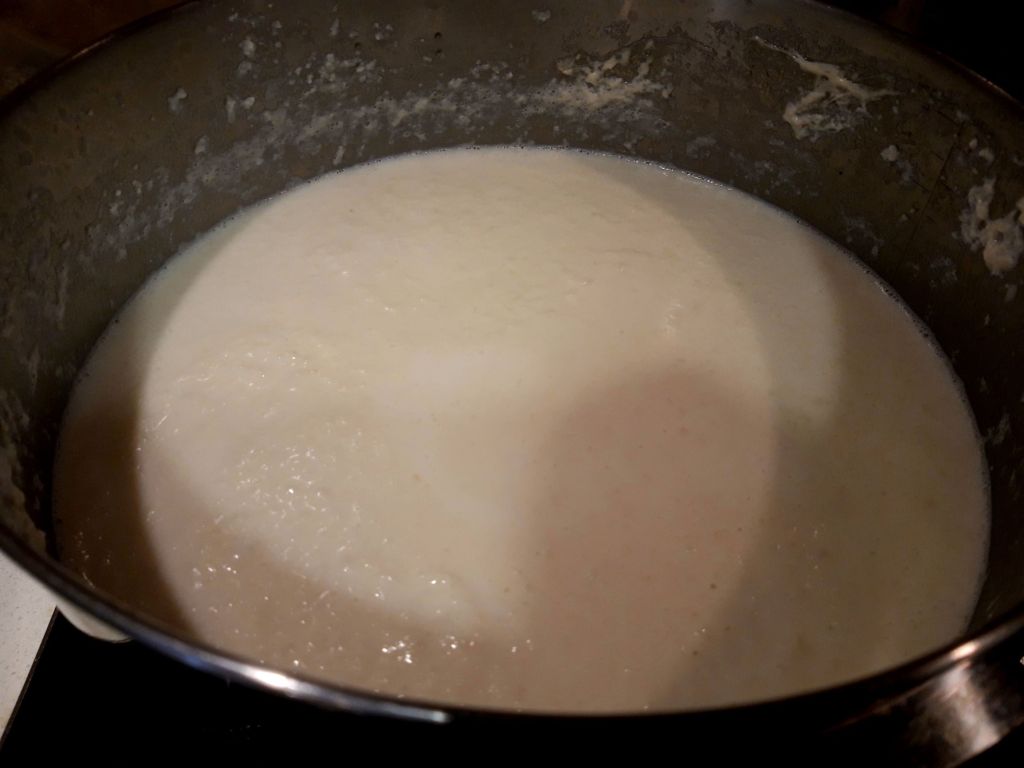 Când ceapa și-a schimbat un pic culoarea punem conopida, merele și laptele, amestecăm.