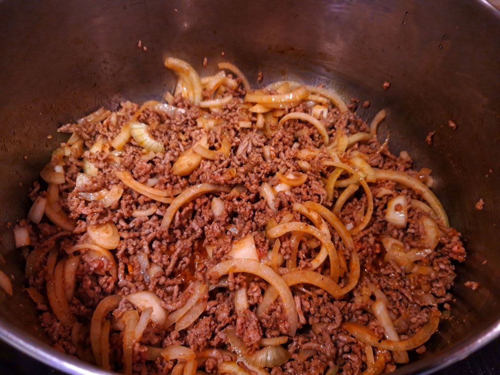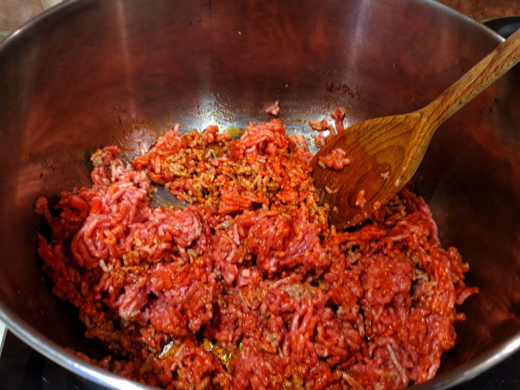 Încingem uleiul într-o cratiță. Adăugăm carnea tocată, sare, piper, ardei iute, chimionul și paprika, le amestecăm bine la foc mare 2-3 minute.