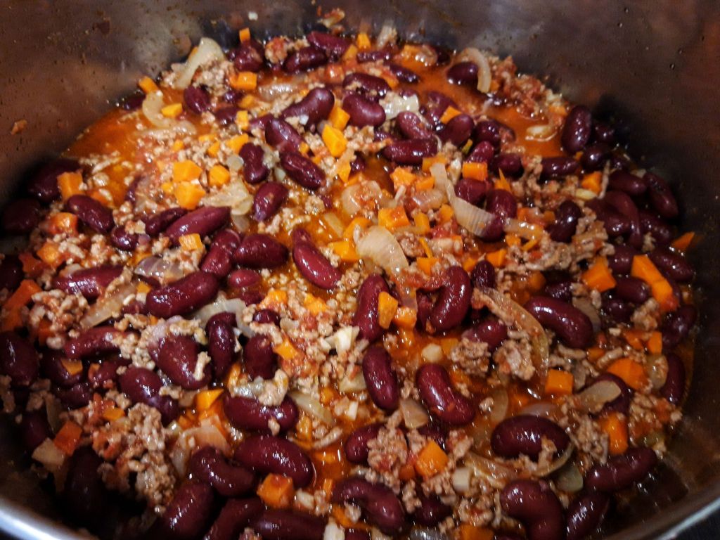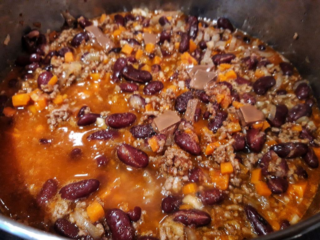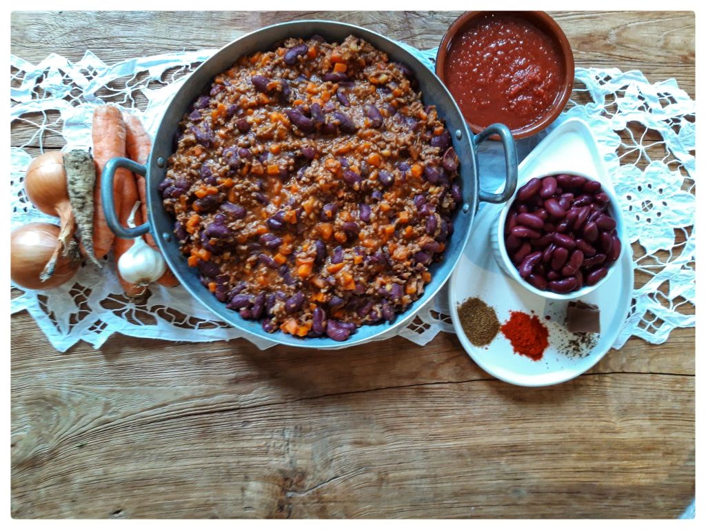 Este simplu de făcut, cheia este să fierbem fasolea înainte, altfel poate dura foarte mult. Merge și cu fasole din conservă. Am făcut-o în nenumărate moduri și ne-am hotărât că ne place cel mai tare cu fasole roșie boabe, paprika, chimion, multă pudră de ardei iute și 3-4 cuburi de ciocolată adăugate la final. Ava mănâncă de pe la 10 luni chili con carne, doar că la început fierbeam toate ingredientele. După ce a împlinit un an jumate am început să călesc un pic legumele la început. În continuare nu o fac picantă, deși este mult mai gustoasă, fiecare își adaugă în farfurile sos picant sau fulgi de ardei.