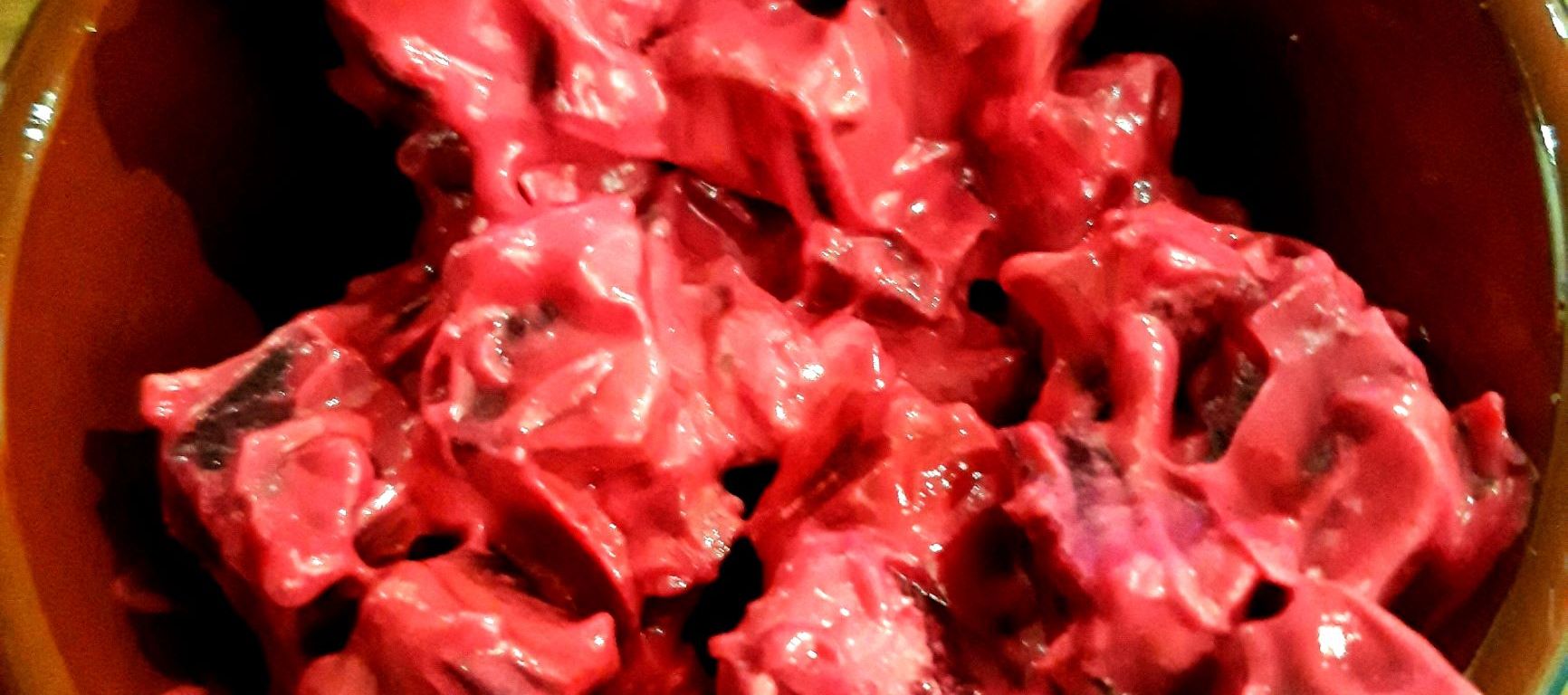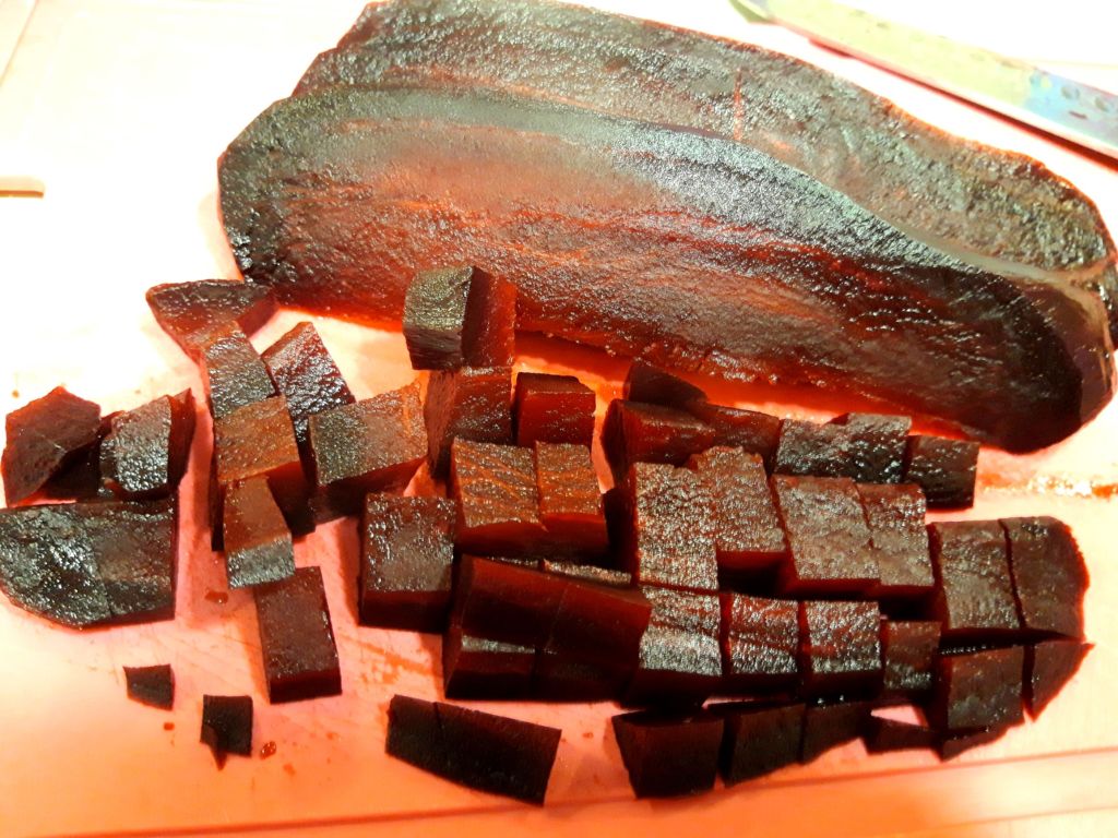Fierbeți sfecla în coajă, scurgeți-o, și după ce s-a răcit îndepărtați coaja și tăiați-o cuburi.