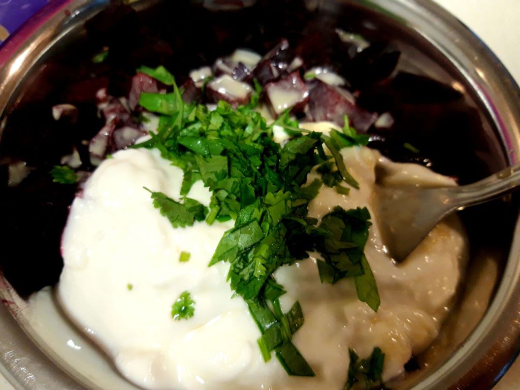 Într-un castron adăugați sfecla tăiată cuburi, sosul de tahini cu iaurt, sare după gust și pătrunjelul sau coriandrul. Amestecați.