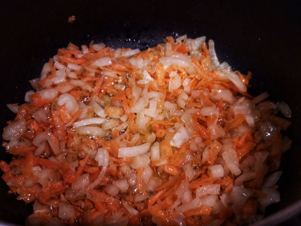 Curățăm morcovii și ceapa, îi tăiem mărunt și îi punem la prăjit în uleiul încins. Când legumele și-au schimbat un pic culoarea, adăugăm cartofii fierți tăiați cuburi, varza și amestecăm bine.