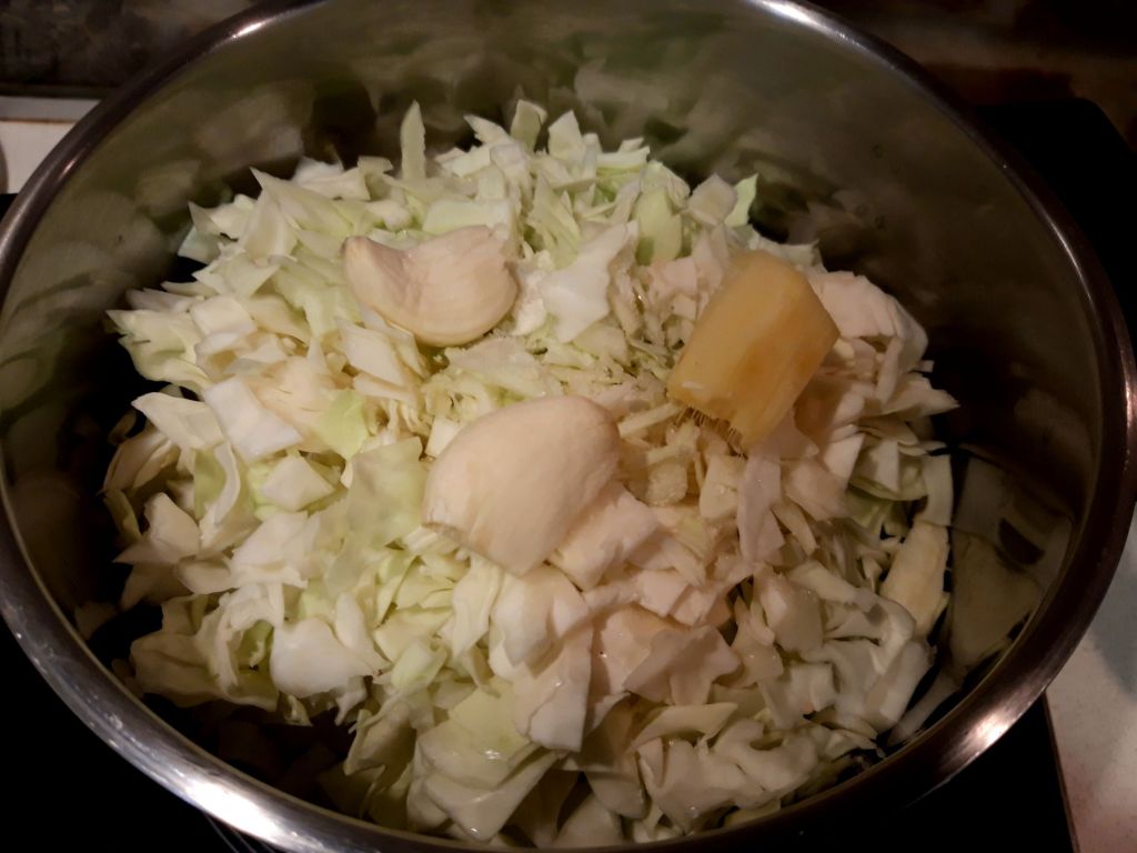 Punem la fiert varza tocată cu usturoiul și ghimbirul (dacă vă place, dacă nu, săriți peste ghimbir), sare, piper după gust.