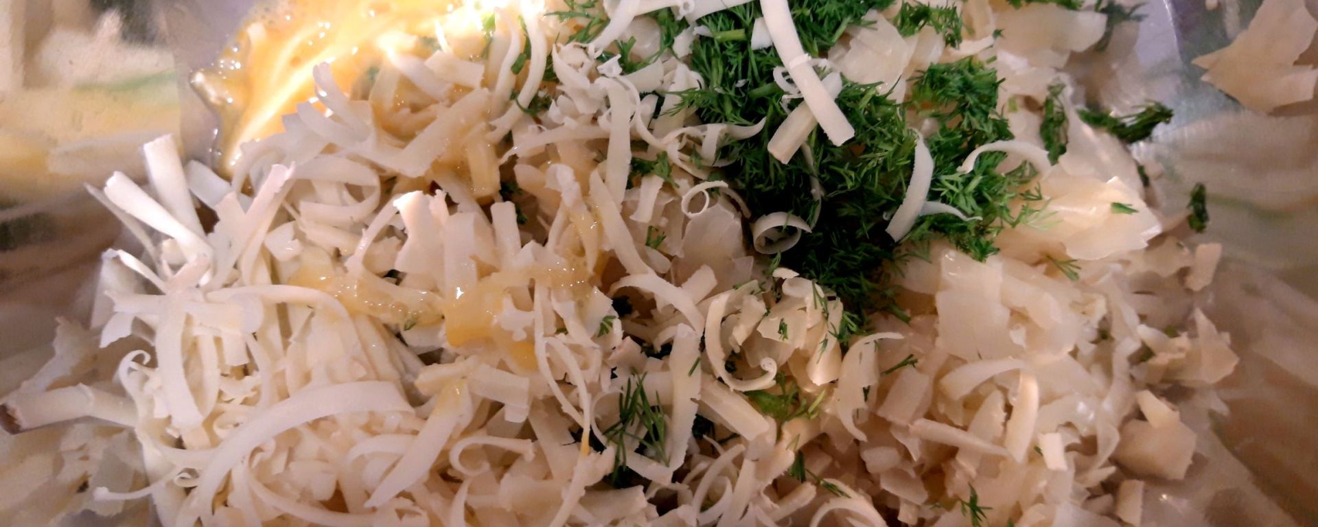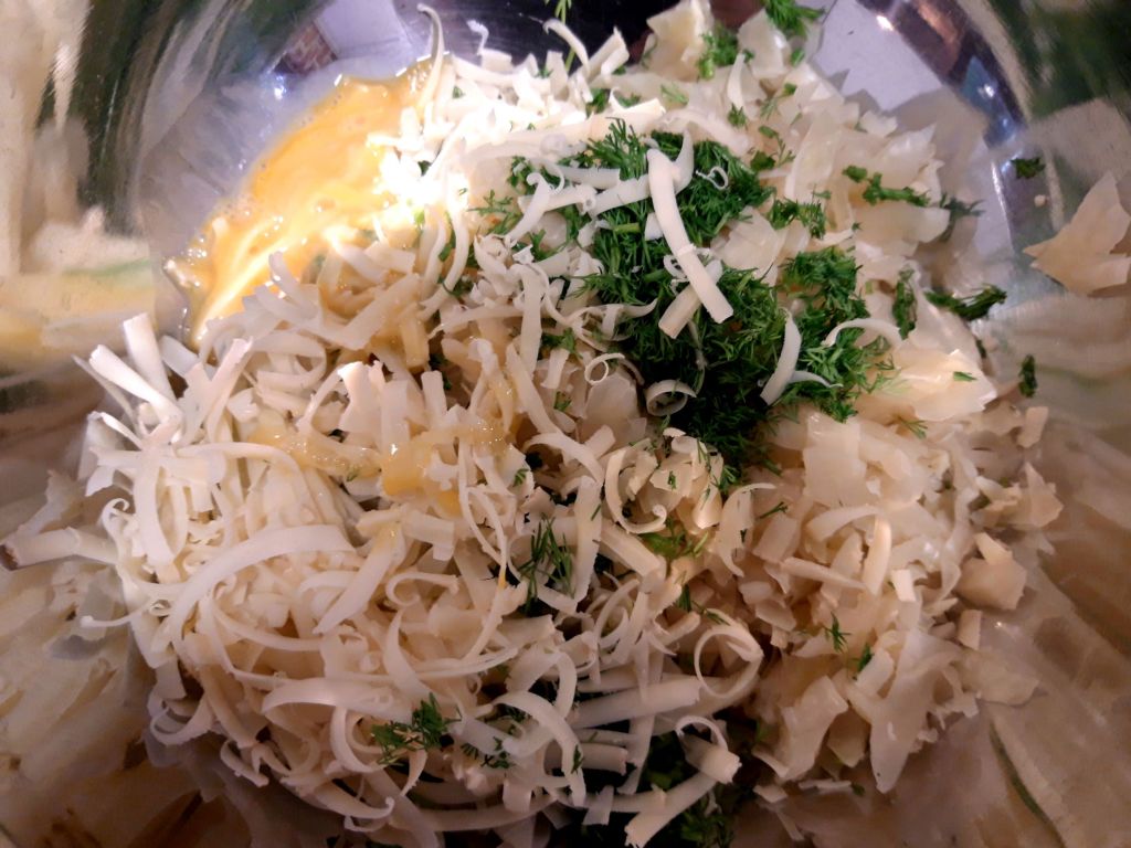 Când varza s-a fiert, o scurgem și o punem într-un bol împreună cu ouăle bătute, brânza rasă, mărar și sare, piper după gust.