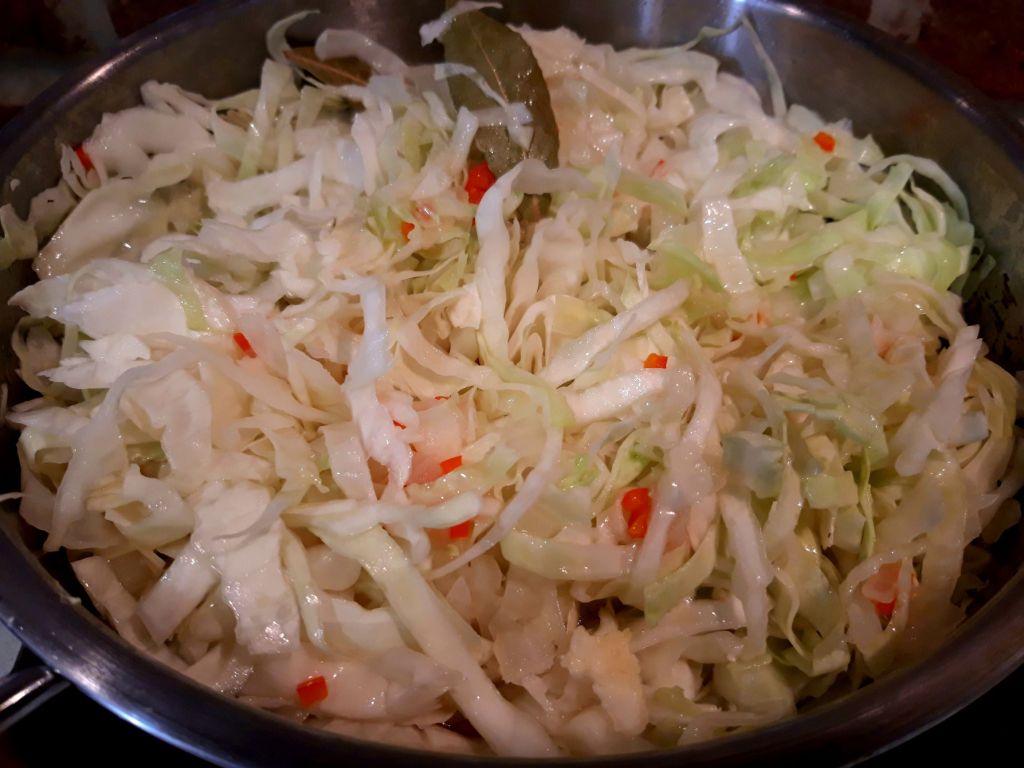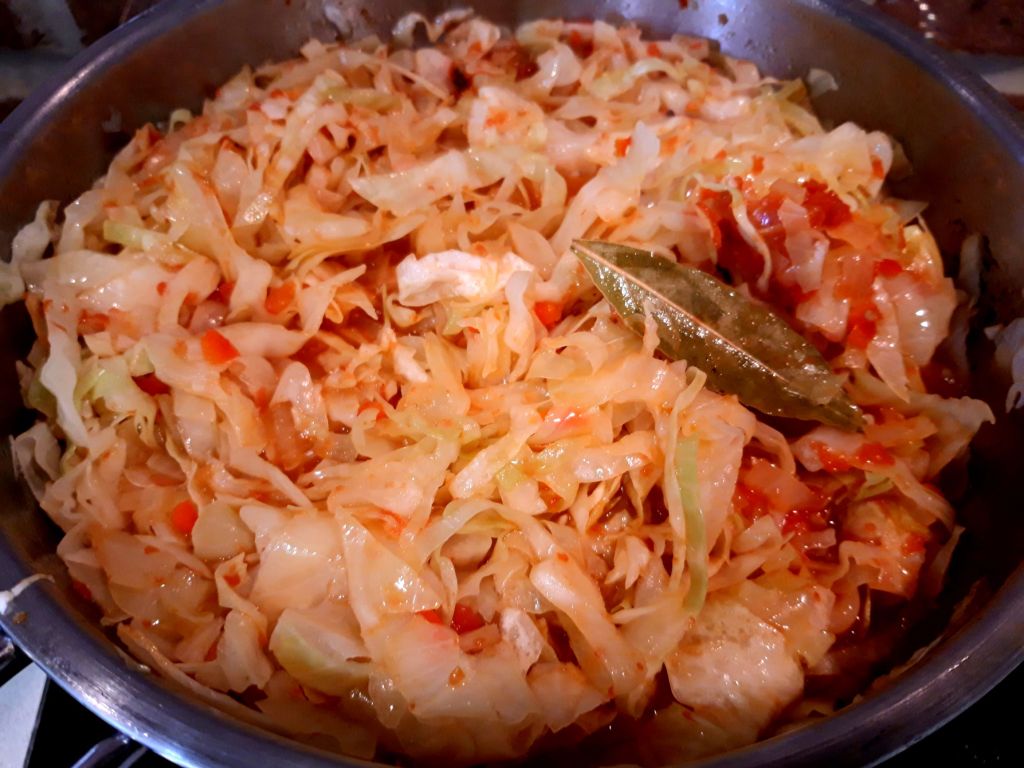 Cum fac și alte lucruri în același timp, eu acopăr varza cu un capac și o gătesc la foc mic. Mai trec din când în când să amestec.