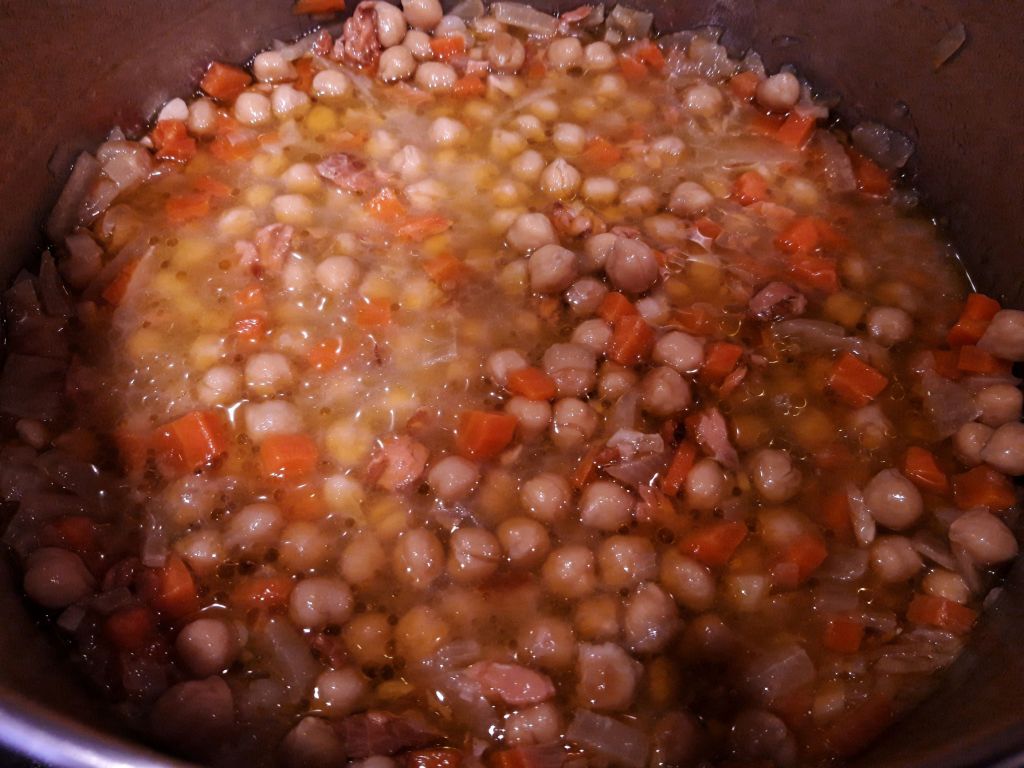 Turnăm compoziția peste năutul care fierbe și mai lăsăm 15-20 minute. Cel mai bine gustăm să ne asigurăm că sunt făcute.
