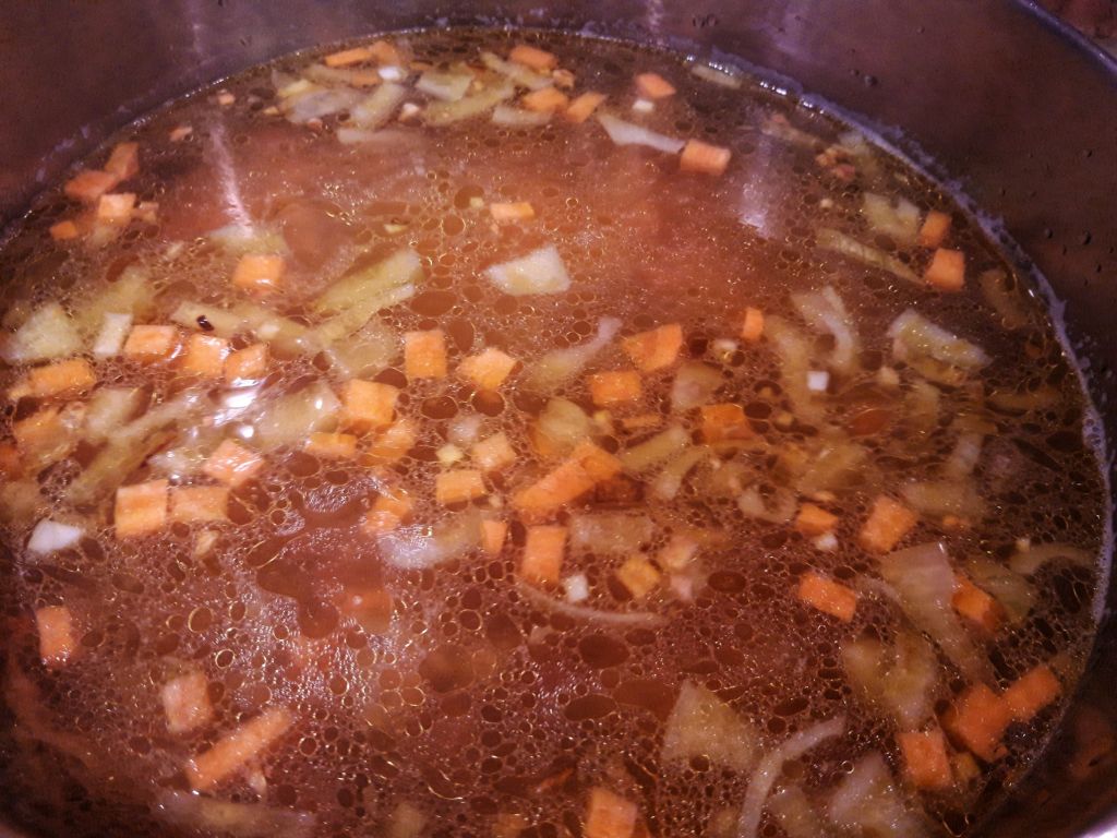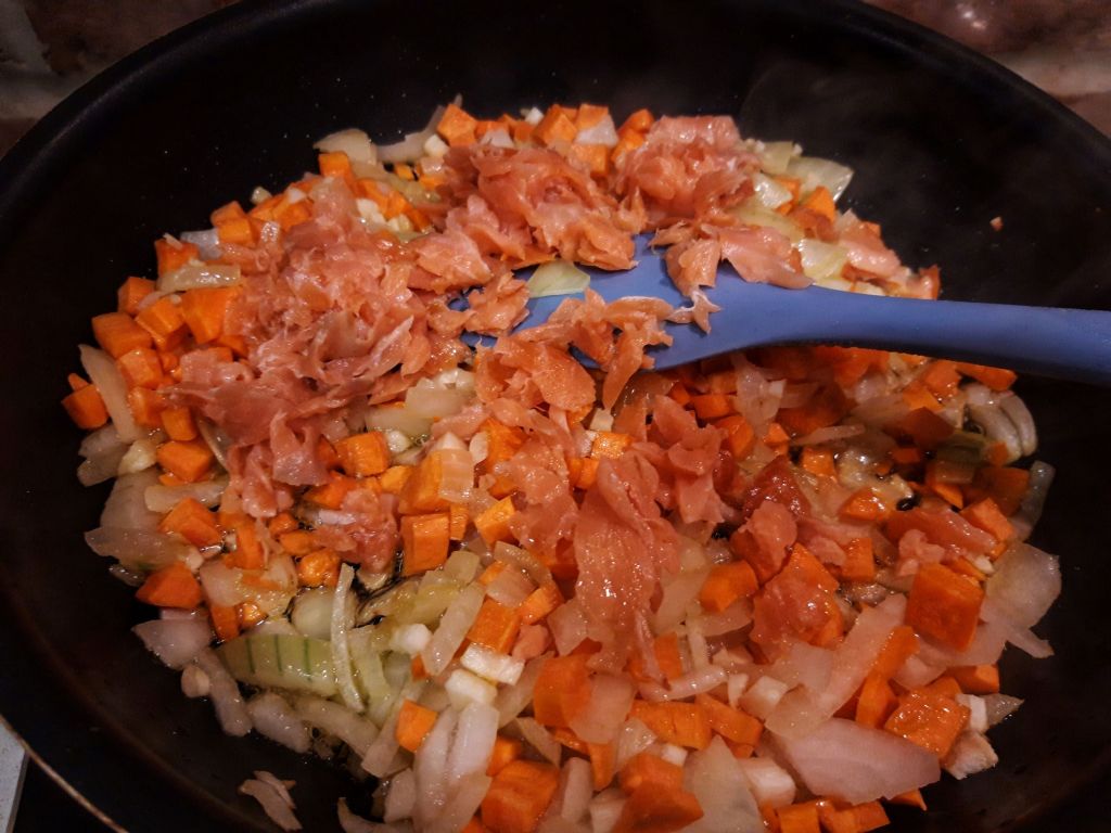 Într-o tigaie cu ulei încins călim întâi ceapa 1-2 minute, până își schimbă un pic culoarea, apoi adăugăm morcovul, păstârnacul sau țelina, usturoiul și peștele afumat. Amestecăm și lăsăm 3-4 minute pe foc, până își schimbă un pic culoarea.