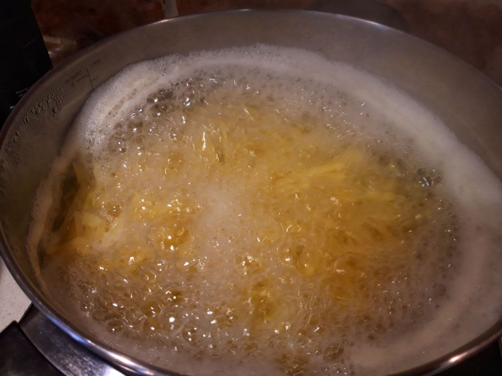 Punem cartofii în apă fierbinte și îi lăsăm să fiarbă 2-3 minute. Îi gustăm, cheia e să fie mai al dente. Îi scurgem bine și îi punem într-un bol.