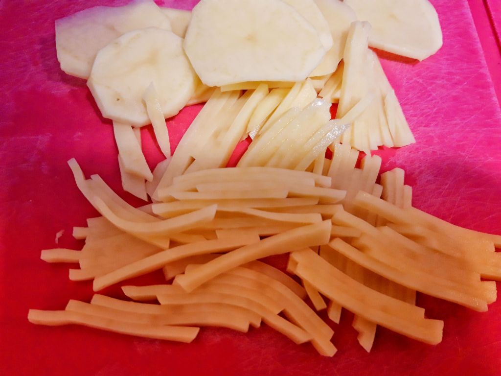 Curățăm cartofii și îi tăiem în fâșii cât mai subțiri, ca niște bețișoare. Îi puteți da și prin răzătoarea mare dacă vi se pare mai simplu.