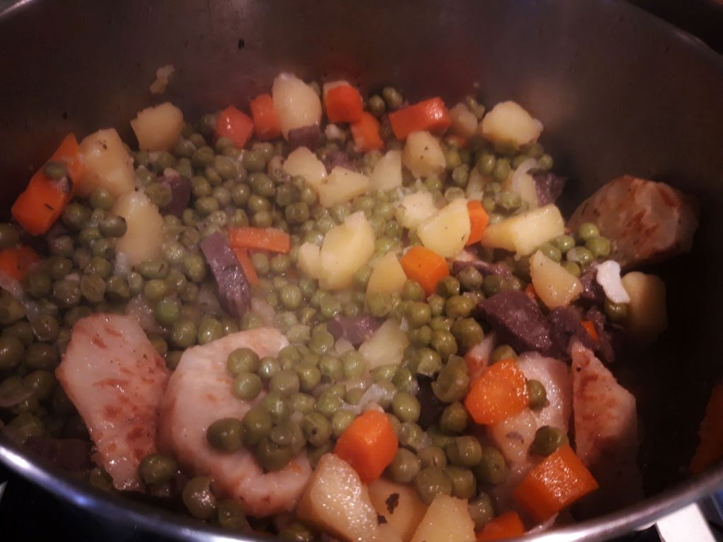 După 3-4 minute adaug mazărea și cartofii tăiați cuburi, amestec și completez cu o jumate de cană de apă. Puteți folosi bulion, eu o servesc așa, are suficientă aromă și consistență de la mixul de legume folosit. Acoperiți și gătiți la foc mic.