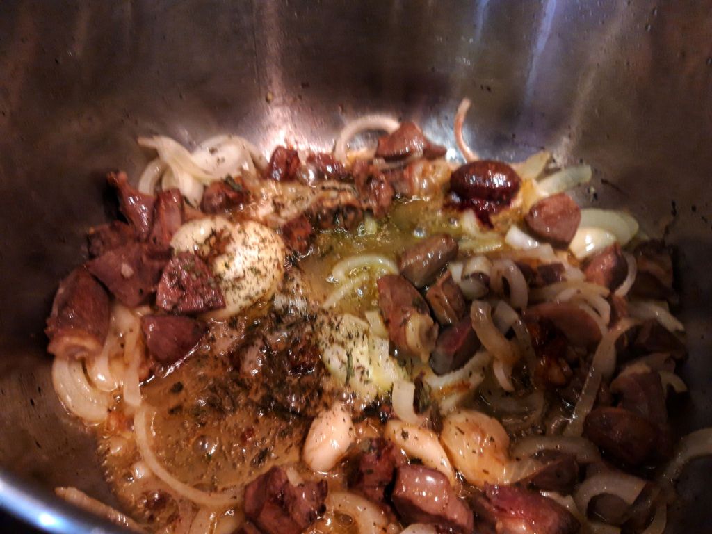 Curățăm legumele, tăiem ceapa rondele, pisăm usturoiul și tăiem inimile și pipotele. Nouă ne plac tăiate în bucăți mai mici, cât să luăm o dată în furculiță. În uleiul încins călim ceapa. După ce s-a îngălbenit, punem organele, usturoiul, menta și busuiocul, amestecăm.