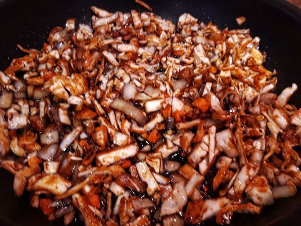 Când legumele și-au schimbat un pic culoarea punem varza tocată mărunt și cele 2 linguri de sos de soia. Lăsăm pe foc încă 3-4 minute, timp în care amestecăm bine.