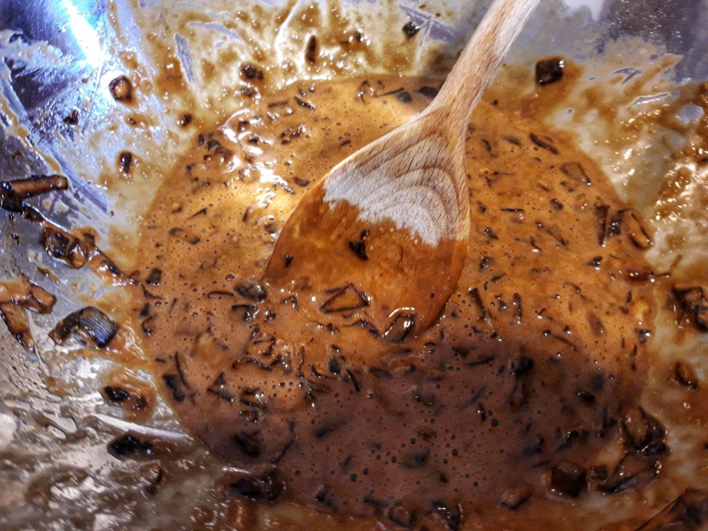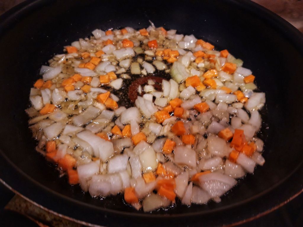Tăiați mărunt ceapa, morcovul, ghimbirul și pisați usturoiul. Într-o tigaie încingeți uleiul de susan, căliți mai întâi ceapa 1-2 minute apoi completați cu morcovul, usturoiul și ghimbirul (dacă ați ales să puneți și ghimbir). Amestecați și lăsați-le pe foc încă 2-3 minute.