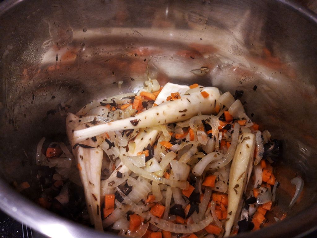 Când ceapa și-a schimbat un pic culoarea adăugăm morcovul tăiat cuburi mici, ciupercile și păstârnacul sau țelina și le mai prăjim 2-3 minute. Las păstârnacul mare iarna că e ațos și nu tuturor le place, așa îl pot scoate din farfuriile nedoritorilor…
