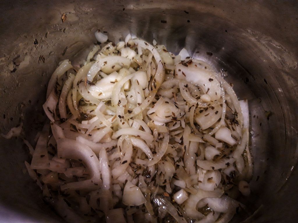 Într-o oală cu ulei încins punem 2 minute ceapa și tarhonul la călit.