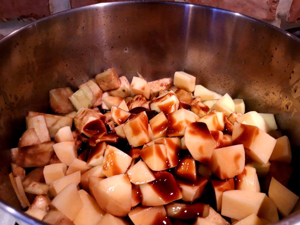 După ce vinetele și-au schimbat un pic culoarea adăugăm cartofii tăiați cuburi medii, sosul de soia, amestecăm bine și le lăsăm să se pătrundă la foc mic, sub capac. În funcție de cât de mult lichid este, poate fi nevoie să adăugăm o jumătate de pahar de apă.