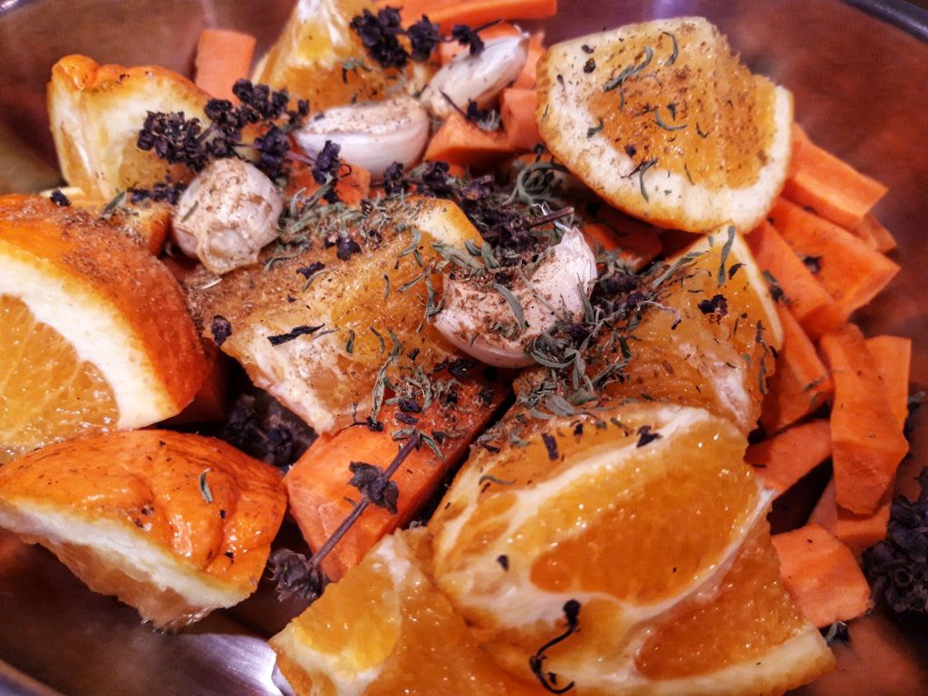Într-un vas cu apă punem morcovii tăiați, cățeii de usturoi lăsați în coajă, portocala tăiată în 6, cimbrul, busuiocul, chimionul și sare, piper după gust. Îi lăsăm la fiert 8-10 minute, îi scurgem (am îndepărtat crenguțele de cimbru și busuioc), am stors portocala și am lăsat 3 bucăți pentru aspect.