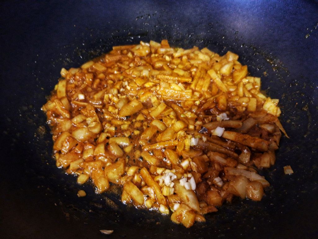 Tăiem ceapa, ghimbirul și le trântim în uleiul încins împreună cu amestecul pt curry. Amestecăm.
