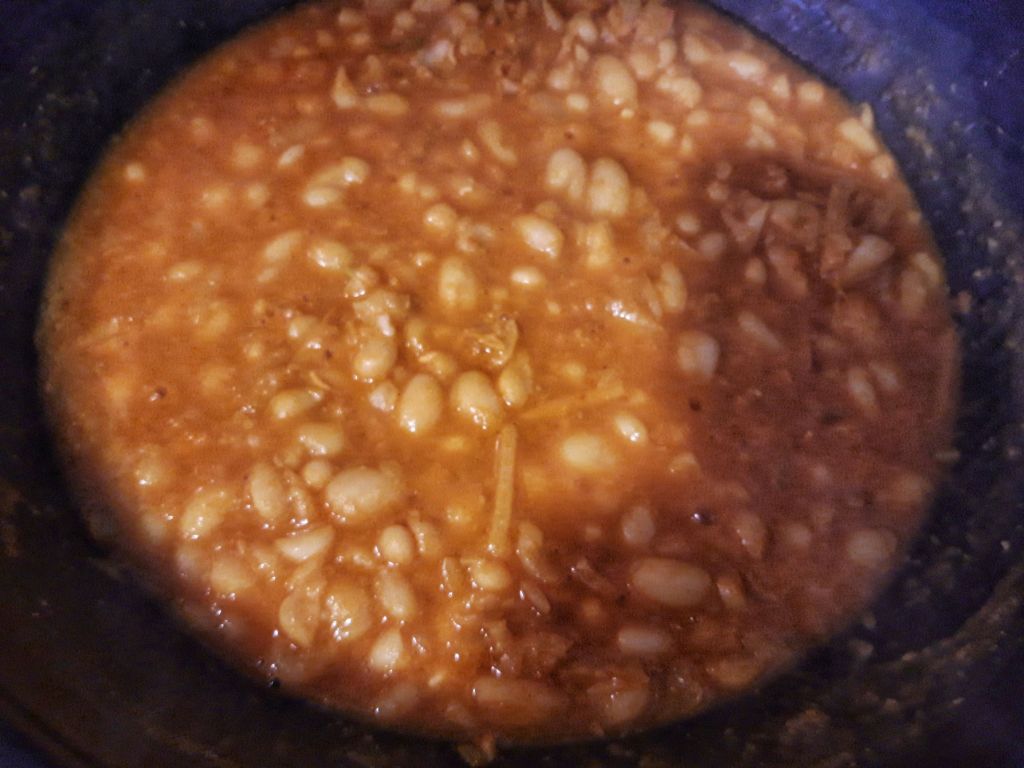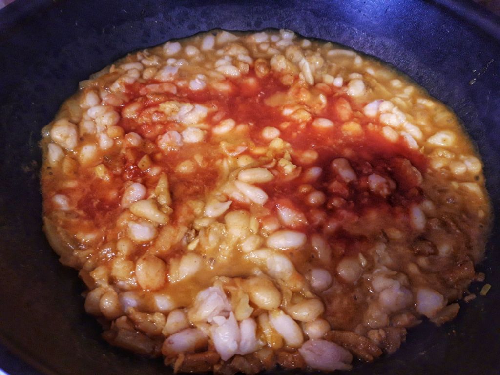 După 2-3 minute adăugăm fasolea scursă, usturoiul și bulionul. Completăm cu 2-3 linguri din zeama în care a fiert fasolea.