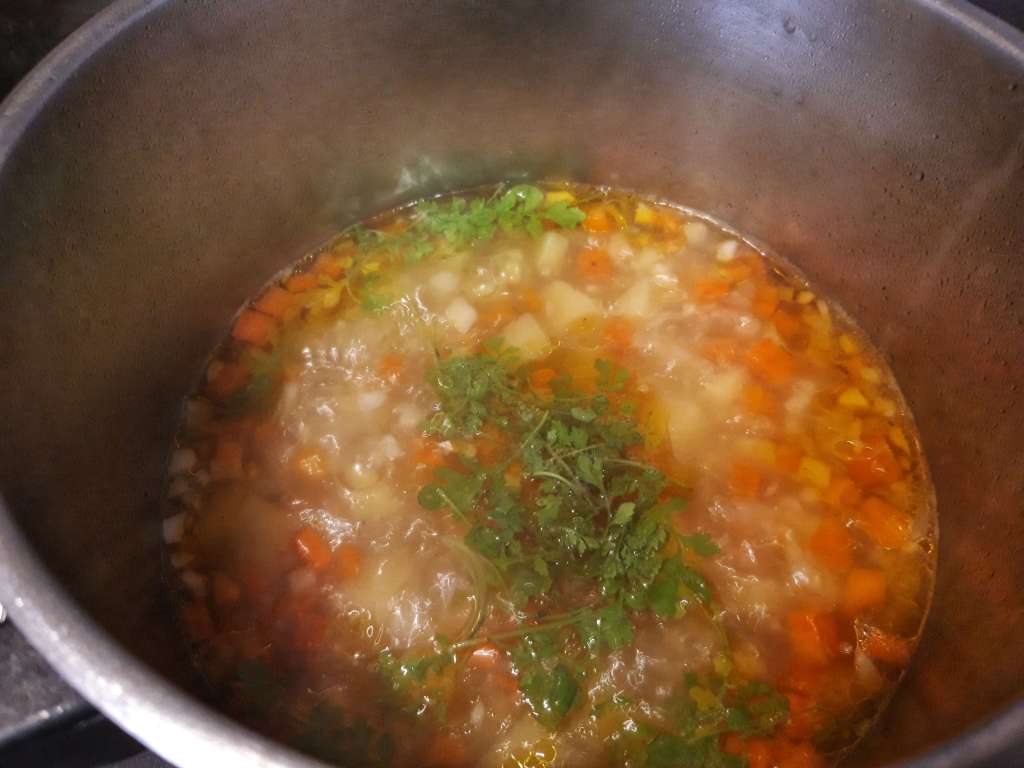 Adăugăm apă, punem capacul și lăsăm să fiarbă. Înainte să mă învăț cu cratițele sau oalele noi, pentru 4 porții de supă adăugam 4 boluri jumate de apă. Foloseam bolul sau farfuria de supă în care urma să o servesc.