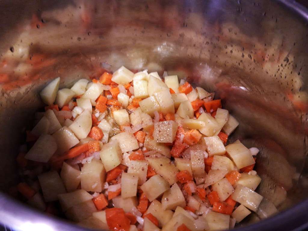 Când legumele și-au schimbat un pic culoarea punem cartofii tăiați cuburi (cu cât îi tăiem mai mici și mai egali cu atât fierb mai repede), usturoiul, mai lăsăm 1-2 minute, amestecăm.