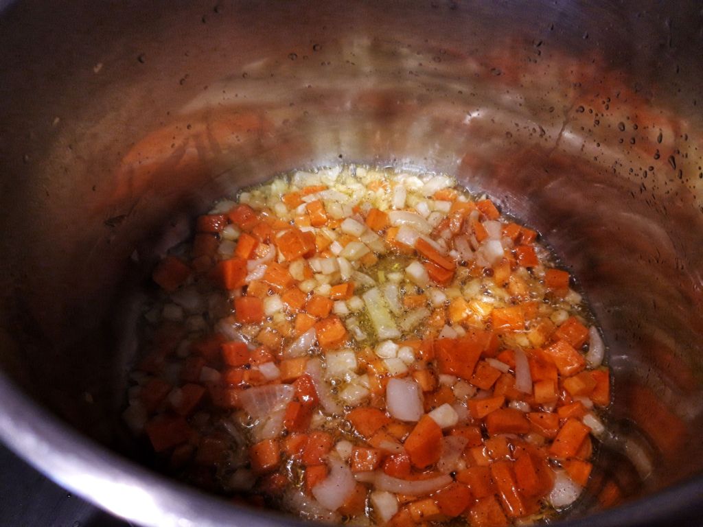 Într-o oală cu ulei încins punem 2 minute ceapa la călit, apoi morcovul și păstârnacul/țelina.