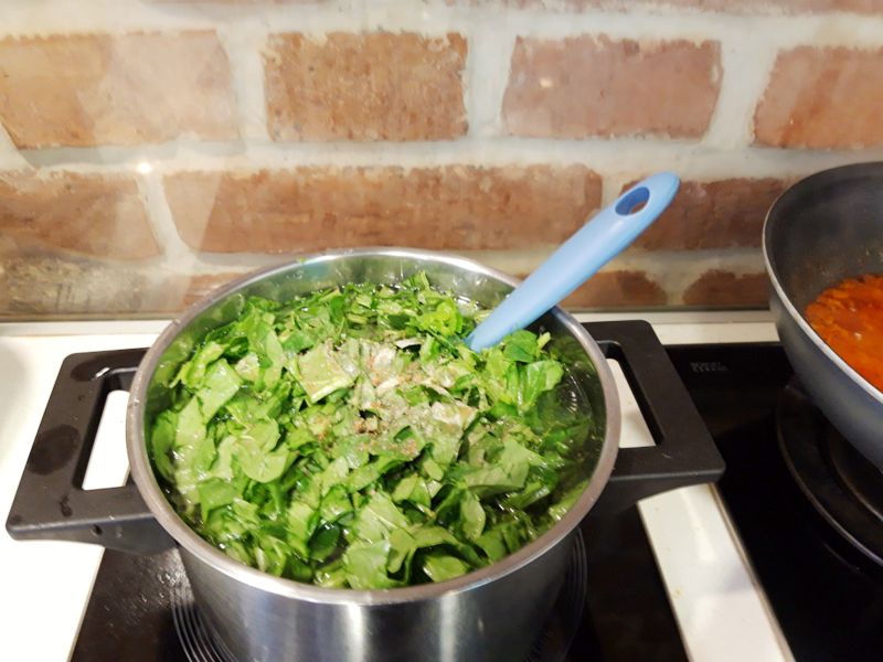 E simplă, absolut delicioasă dacă vă place spanacul. Folosesc rețeta mamei și a bunicii la care am făcut o singură modificare: ele opăreau întâi spanacul, apoi îl scurgeau, îl răceau și-l tocau mărunt. Cum evit să manevrez pe lângă copil lucruri fierte și nici nu am foarte mult timp la dispoziție, am ales să spăl spanacul, să-l toc mărunt și să-l pun așa la fiert. E la fel de gustoasă!