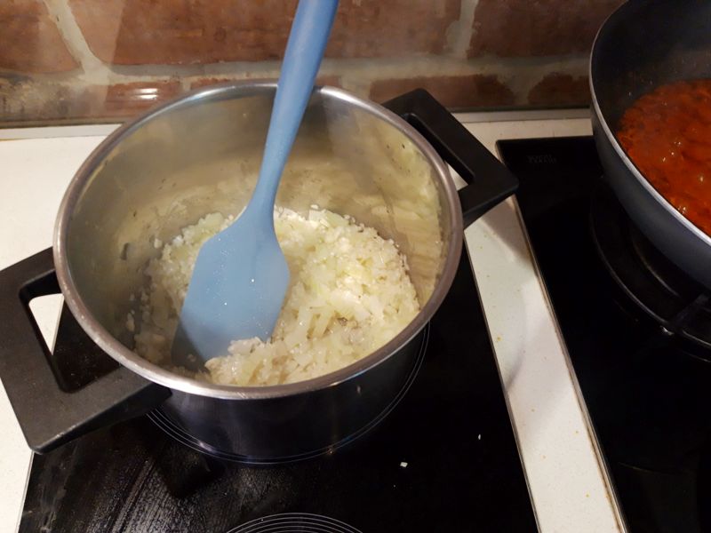 Într-o tigaie cu ulei încins punem ceapa tăiată cuburi sau rondele și o călim 1-2 minute. Adăugăm apoi orezul și usturoiul mărunțit, amestecăm și mai lăsăm 1-2 minute.