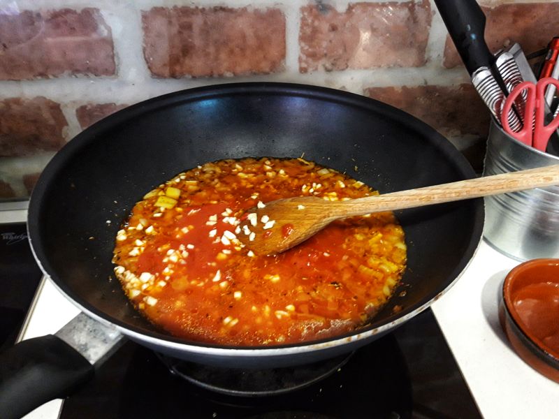 După 2 minute punem usturoiul și pasta de tomate sau roșiile tăiate mici și vinul sau ouzo, lăsăm să fiarbă bine. Gustăm și dacă e cazul punem o linguriță de miere sau alt îndulcitor.