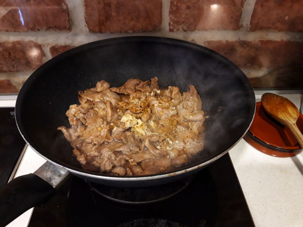 Intr-o tigaie cu ulei incins aruncam marinada cu carne, ghimbirul taiat fasii si amestecam bine la foc mare, pâna ce carnea isi schimba culoarea.