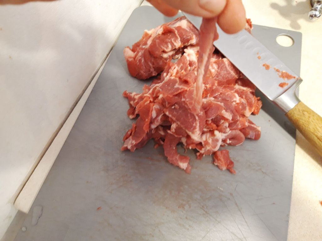 Începem cu operatiunea de finete: taiem ceafa de porc pe fibra, in fasii cat mai subtiri.