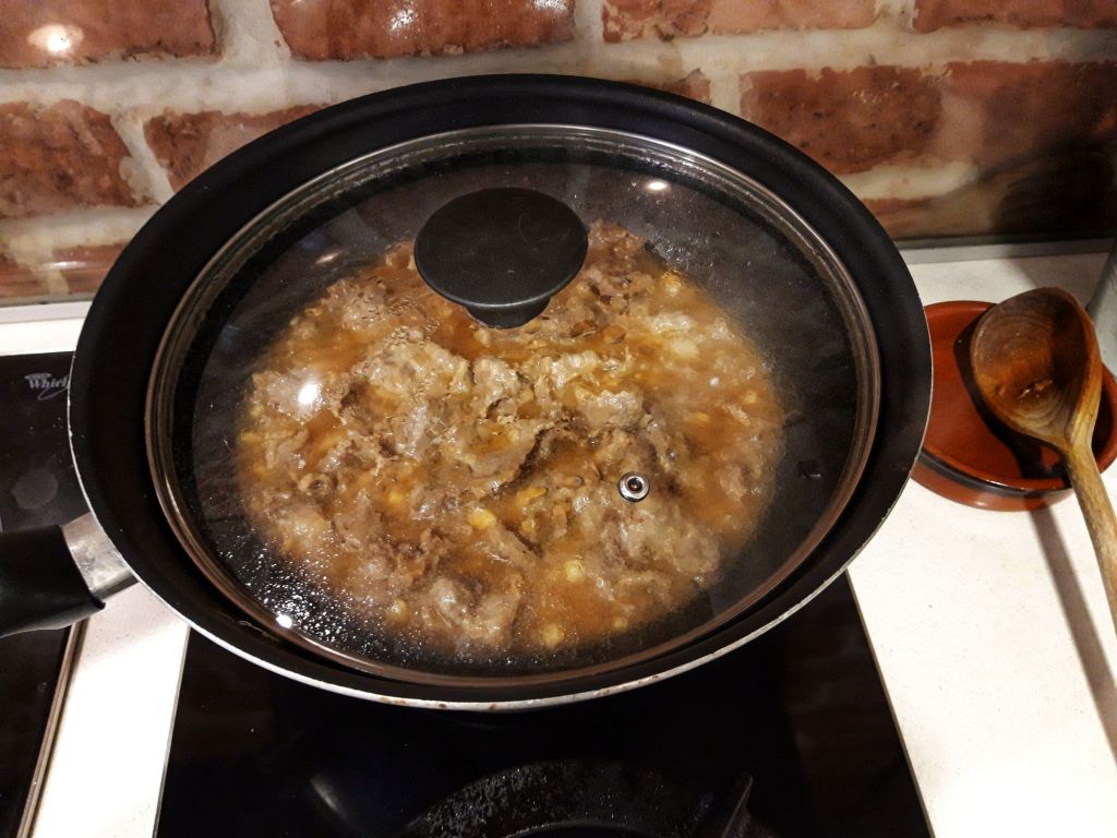 Cand carnea este facuta, scoateti capacul, daca în tigaie e mult sos, mariti temperatura si lasati 1-2 minute sosul sa se ingroase.