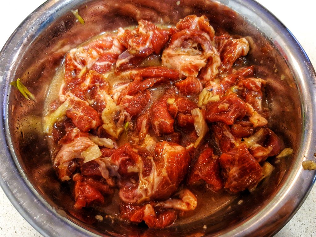 Mutam fasiile de carne intr-un castron si amestecam cu usturoiul pisat, o lingurita de chimen, 2-3 lingurite de sos de soia, amidon si un pic de apa. Lasam cateva minute la marinat.
