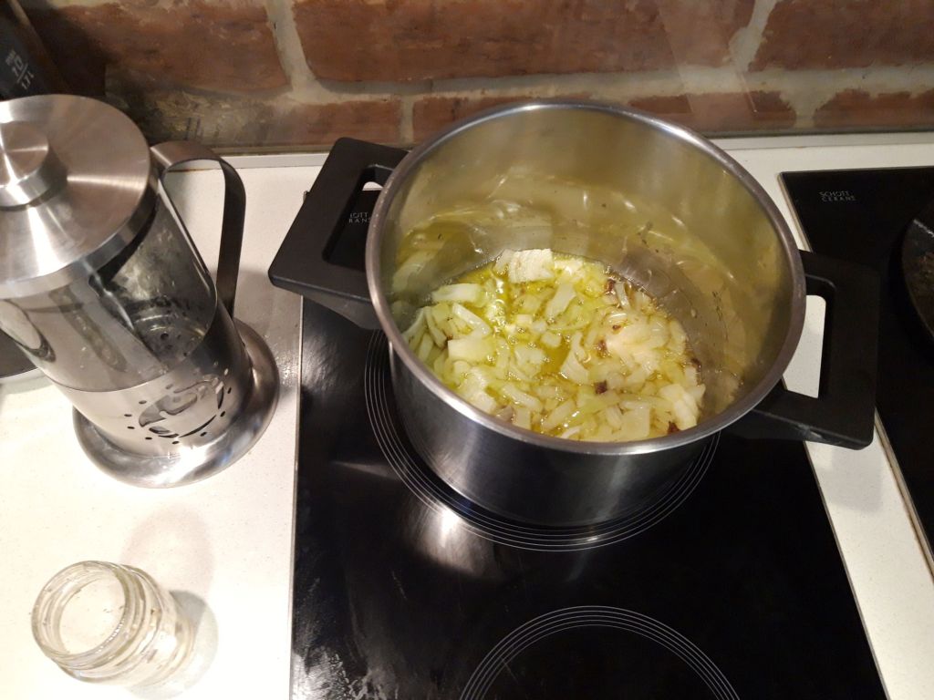 In cratita cu ulei incins calim un pic ceapa, pana se ingalbeneste.