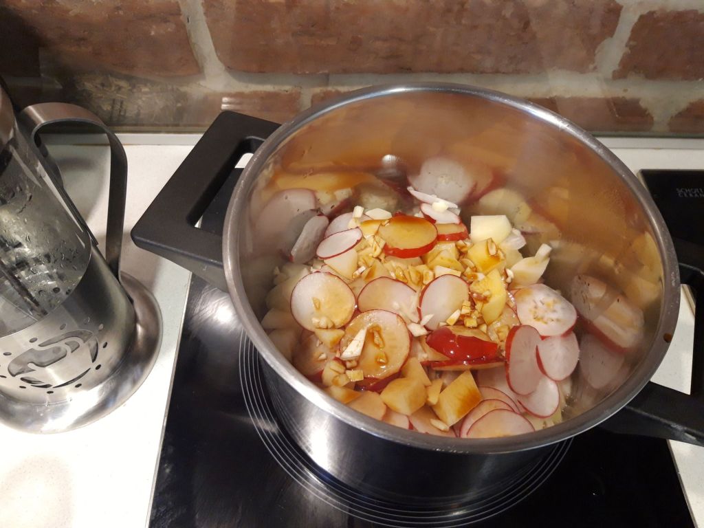 Ne pregatim ingredientele: taiem ceapa, ridichiile, cartofii, maruntim usturoiul si arahidele. Puteti lasa arahidele intregi, eu le pisez ca sa stau linistita cand mananca cea mica.