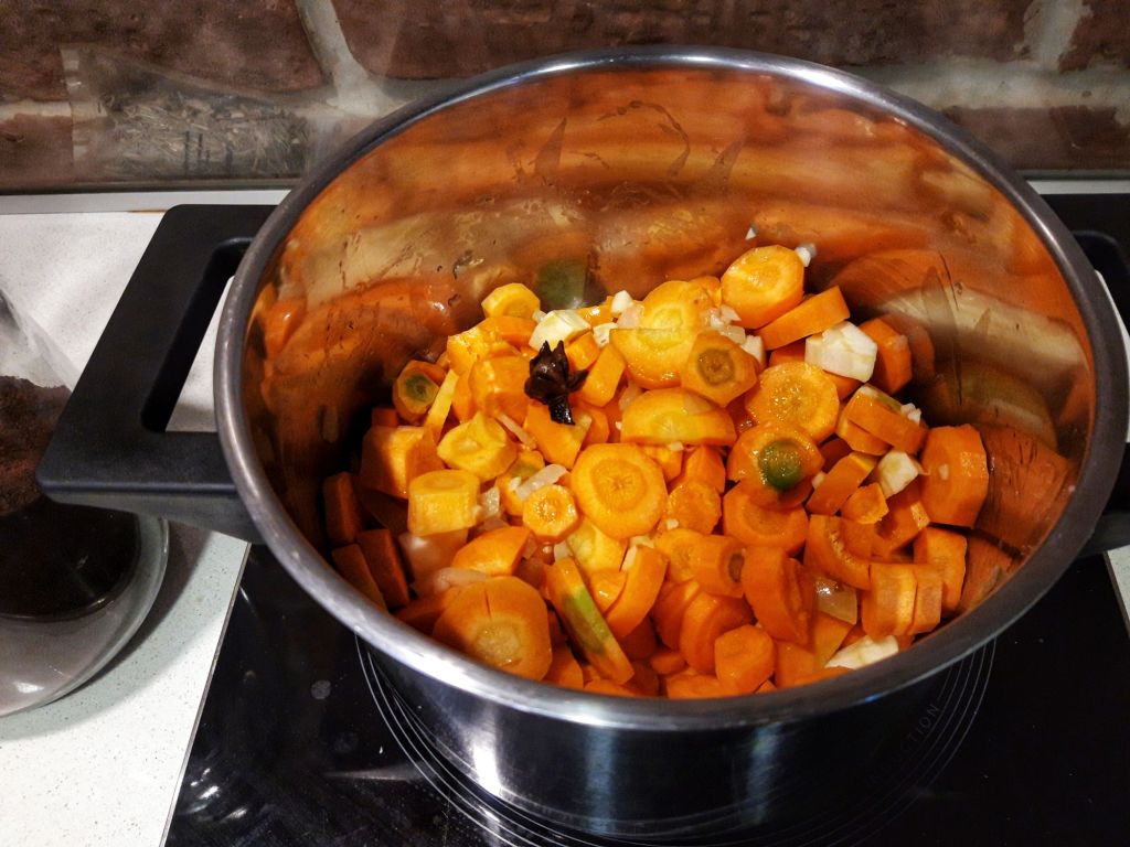 Pe plita mea supa e gata cam în 40 minute la foc mediu, dar cum am mai povestit, scot câte un morcov, îl gust sau verific cu furculița dacă e făcut, ceea ce vă sfătuiesc și pe voi. Timpii de gătit diferă de la un aragaz la altul. Când legumele s-au fiert, scoatem steluța de anason, blenduim și servim. Poftă bună! 🙂