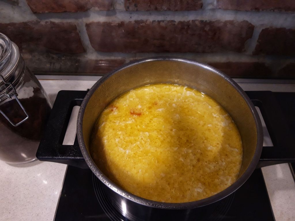 În cazul în care pregătiți supa pentru copii mici, la diversificare, săriți peste această etapă, și puneți toate ingredientele la fiert. În acest caz laptele sau fulgii de cocos se adaugă la sfârșit, nuca de cocos crudă la început.