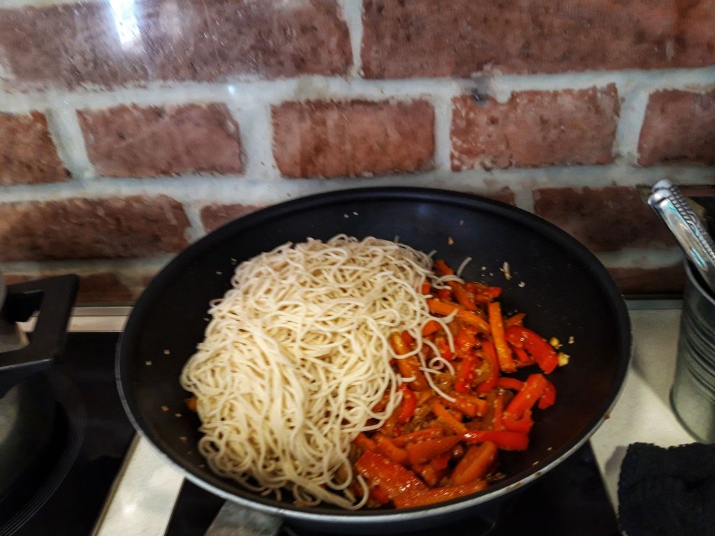 Noodles-ii cu morcov și ardei se fac rapid, cea mai complicată operațiune la această rețetă e tăierea morcovului și a ardeiului în fâșii lungi și subțiri (julienne). Cheia e să gătim foarte puțin legumele, cât să-și mai păstreze din vitamine și minerale.