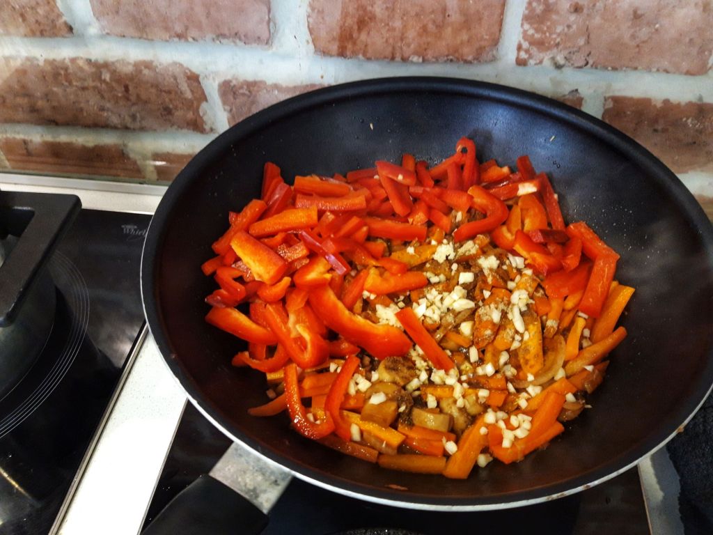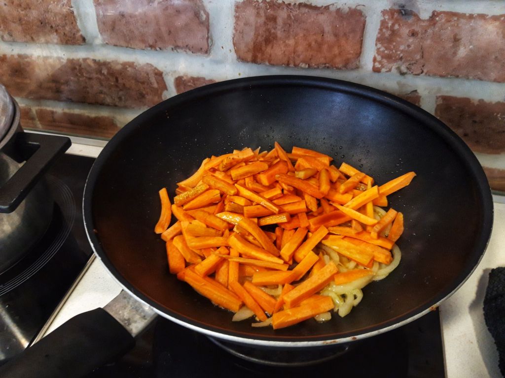 Amestecați bine, după 3-4 minute, când morcovii încep să se înmoaie, puneți ghimbirul, usturoiul, coriandrul pudră, ardeiul gras tăiat fâșii (julienne), susanul și amestecați bine la foc mare.