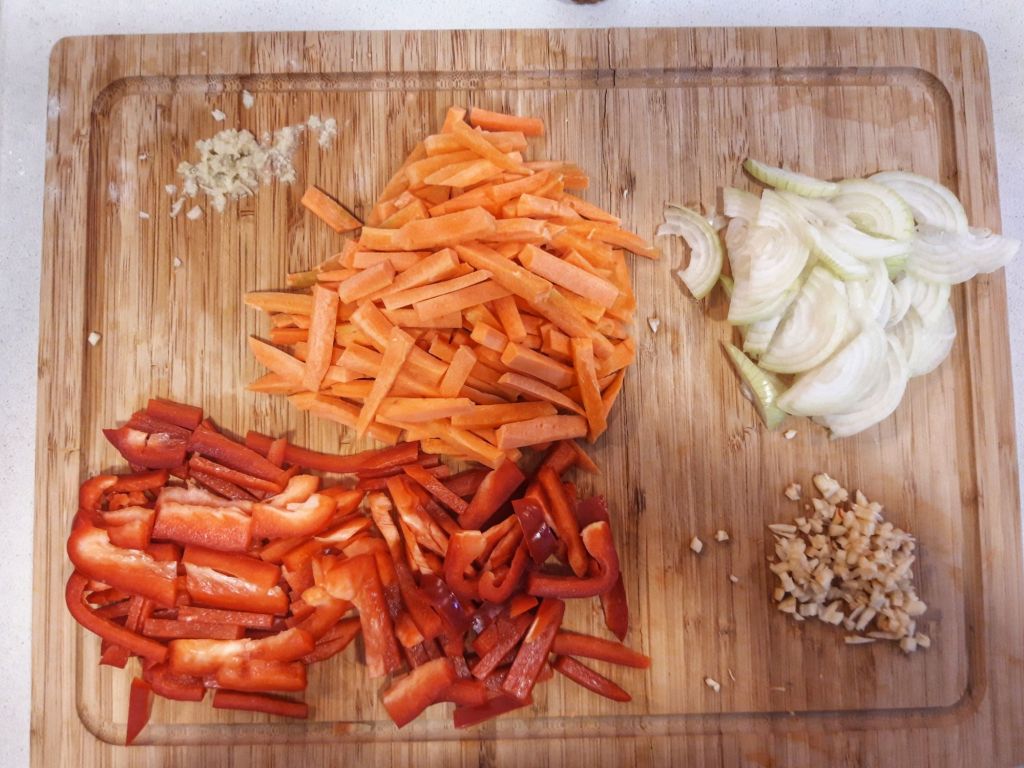 Eu imi pregatesc toate legumele la inceput, fiind o reteta rapida si eu trebuie sa ma misc repede.