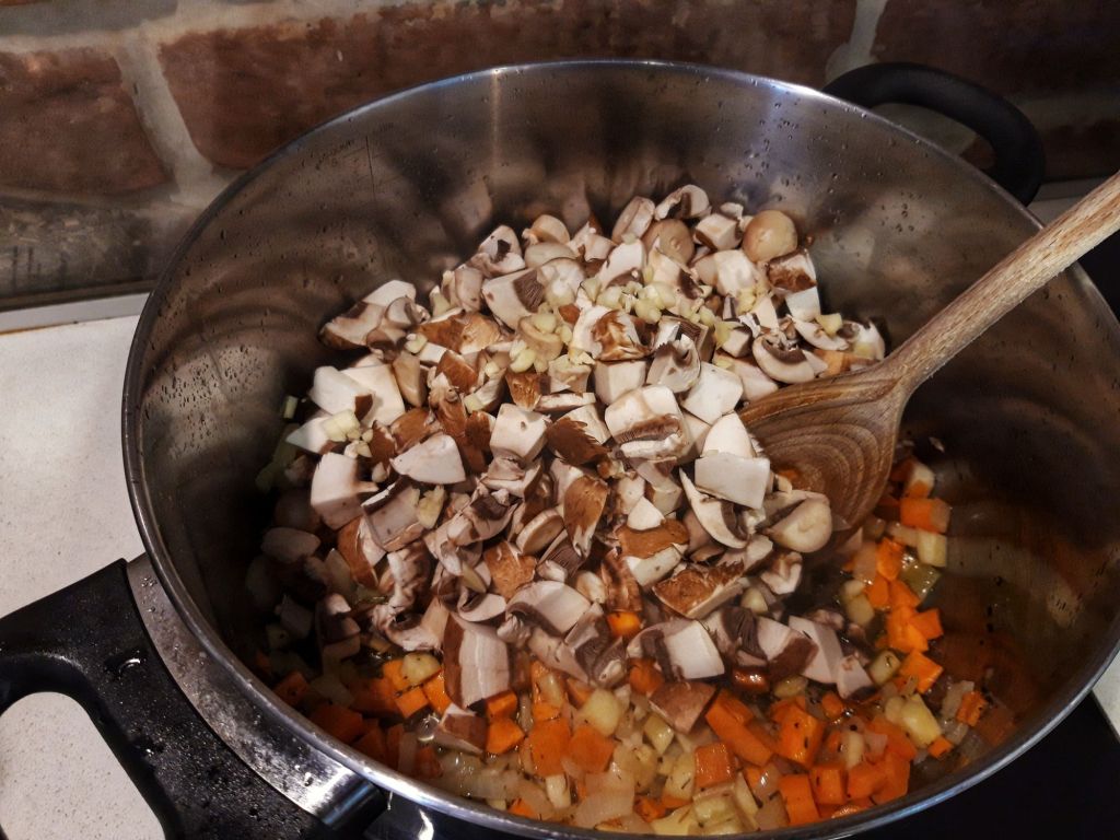 Adaugam morcovul si pastarnacul sau telina taiate cuburi, le calim 1-2 minute si completam cu ciupercile si usturoiul maruntit (eu le tai tot cuburi).