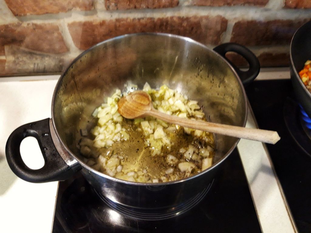 Intr-o alta cratita cu ulei incins calim ceapa si adaugam cimbrul si ienibaharul pisat (daca ati optat pentru el). Amestecam, lasam 2-3 minute.