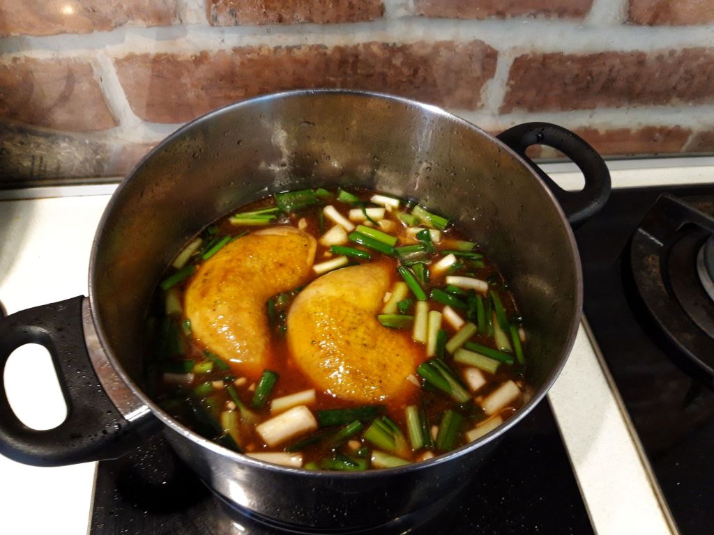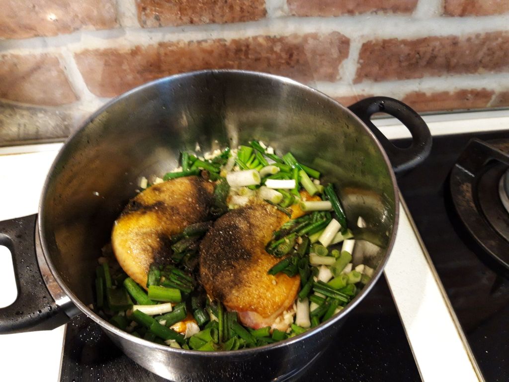 Parlim la aragaz puiul sau il pigulim de resturile de fulgi si pene. Il calim apoi in ulei incins, cat sa se rumeneasca un pic pe ambele parti. Amestec in uleiul incins 1-2 minute ceapa alba tocata; acum pun si cozille de la marar si patrunjel, taiate marunt #fararisipa, le las 1 minut.