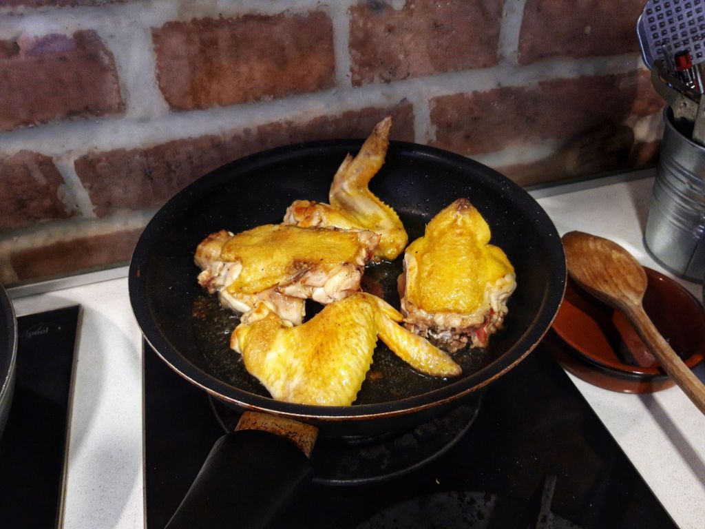 Parlim la aragaz puiul sau il pigulim de resturile de fulgi si pene. Il calim apoi in ulei incins, cat sa se rumeneasca un pic pe ambele parti.