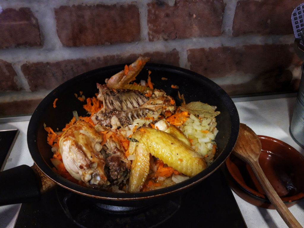 - carne de pui, am folosit 2 aripi si spata taiata in 2, merge si curcan